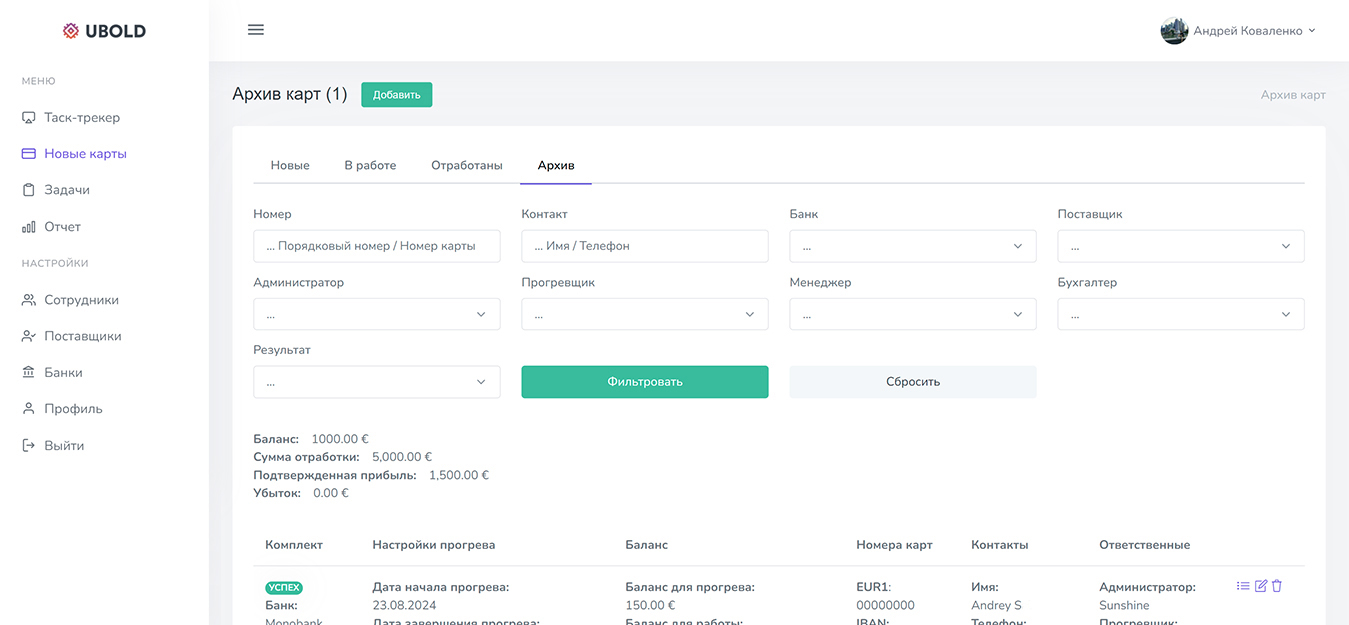 В разделе «Карты» 4 вкладки: «Новые карты», «В работе», «Отработаны» и «Архив». Поскольку первые 3 подраздела небольшие по количеству записей в базе данных, поиск происходит онлайн благодаря плагину datatable. Во владке «Архив» реализованы следующие фильтры: по номеру, по контакту (имя и телефон), по банку, по поставщику, по прогревщику, по менеджеру и по бухгалтеру.