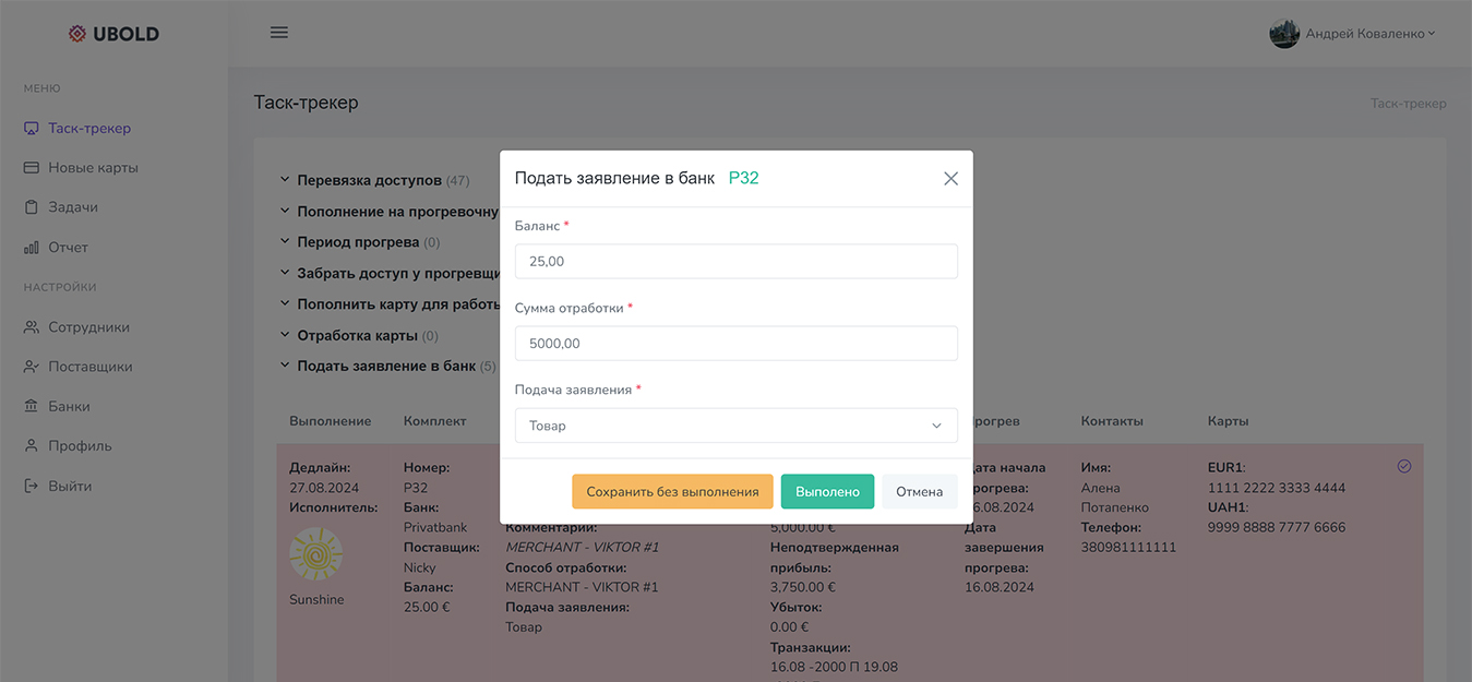 Основной раздел сайта – «Таск-трекер», где размещены все задачи по картам согласно их статусу: «Перевязка доступов», «Пополнение на прогревочную сумму», «Период прогрева», «Забрать доступ у прогревщика», «Пополнить карту для работы», «Отработка карты», «Подать заявление в банк», «Отлежка/Периодическая проверка ответа от банка» и «Возврат поставщику».