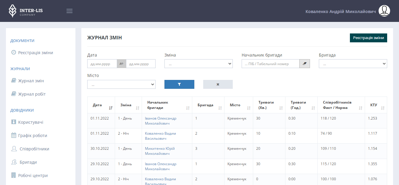 Коэффициент трудового участия формируется при отношении фактической выработки к норме. Средний показатель КТУ смены можно увидеть на странице «Журнал смен», в котором реализованы следующие фильтры: дата, смена, начальник бригады, бригада и город. В таблице можно так же расположены: общее время тревог и соотношение по сотрудникам (сколько фактически было на смене / сколько должно было быть).