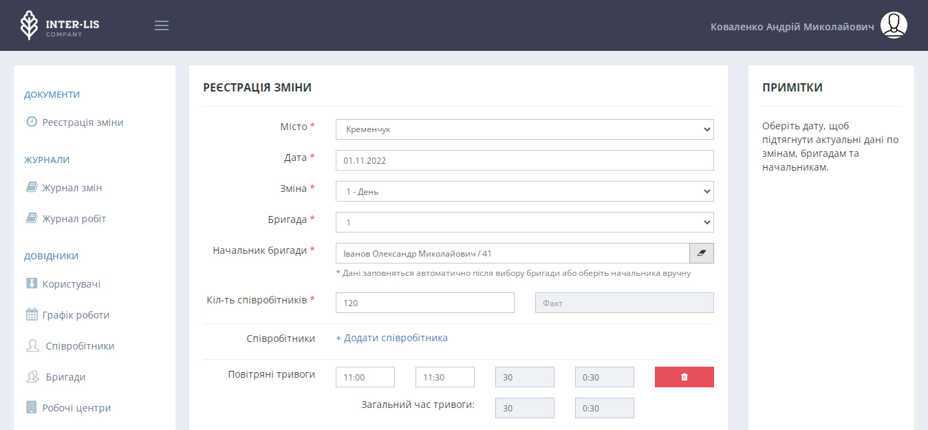 На этой странице можно выбрать сотрудников, которые трудятся на протяжении смены, но не относятся ни к одному рабочему центру 3 уровня. Например, это могут быть водителя. Для них показатель КТУ будет средним за всю смену. Под сотрудниками находятся подпункт «Тревоги», где указываются все воздушные тревоги за смену. По тревогам автоматически происходит калькуляция общего времени. Они влияют на дальнейшие расчеты при расчете чистого времени.