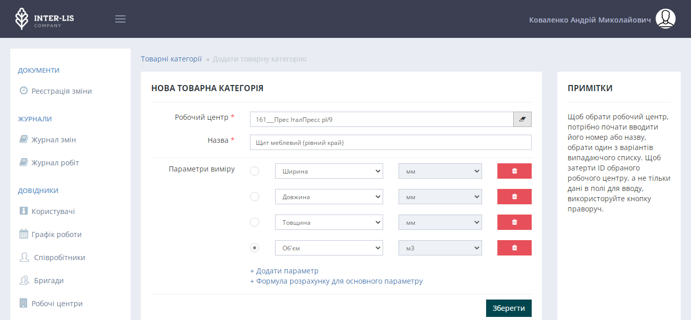 «Товарные категории» относятся к определенному рабочему центру 3 уровня, то есть - к оборудованию. На странице категории можно динамически выбрать параметры и единицы их измерения из соответствующих разделов в «Справочниках». Среди всех параметров выбирается основной (показатель произведенной продукции), который вычисляется на основе остальных данных. Формула для такого расчета указывается на странице редактирования товарной категории.
