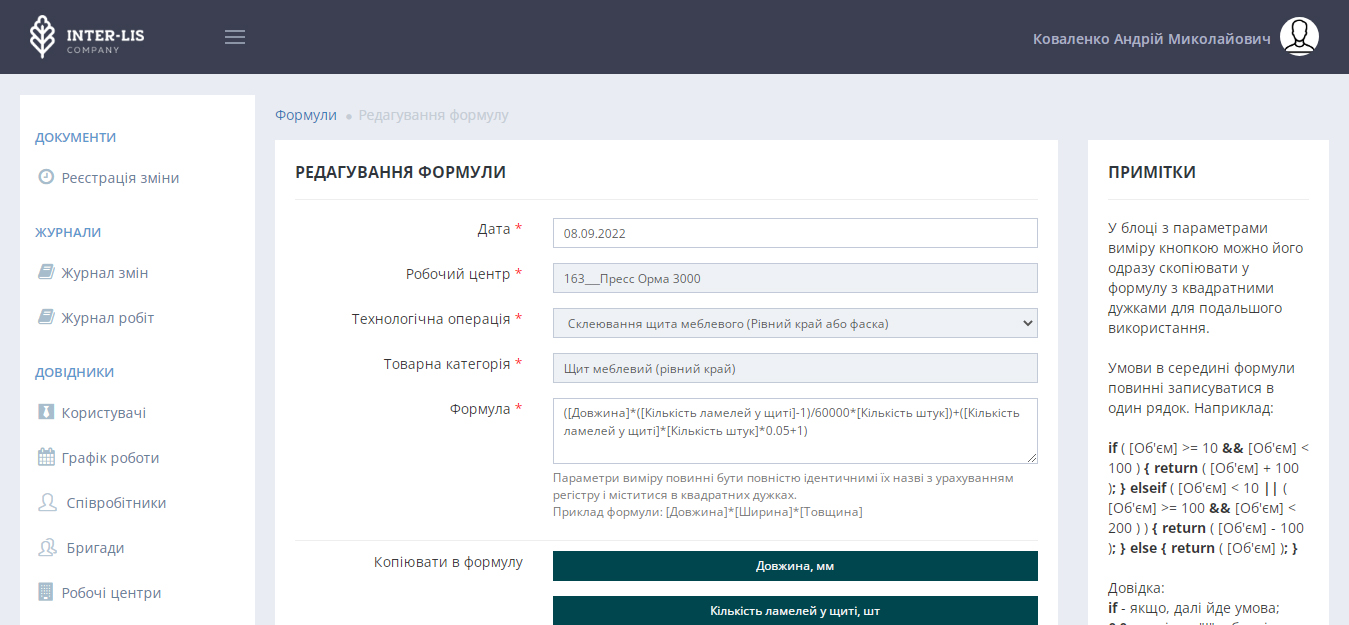 «Нормы выработки» включают в себя товарную категорию со своей формулой, технологическую операцию из соответствующего раздела в «Справочника». Норма выработки показывает: сколько человек в идеальных условиях (соответственно графику работы, без учетов простоев и воздушных тревог) производят продукции. По норме выработки ведется история, как и для ряда других разделов. Данные по расчету строго привязаны к периоду действия нормы.