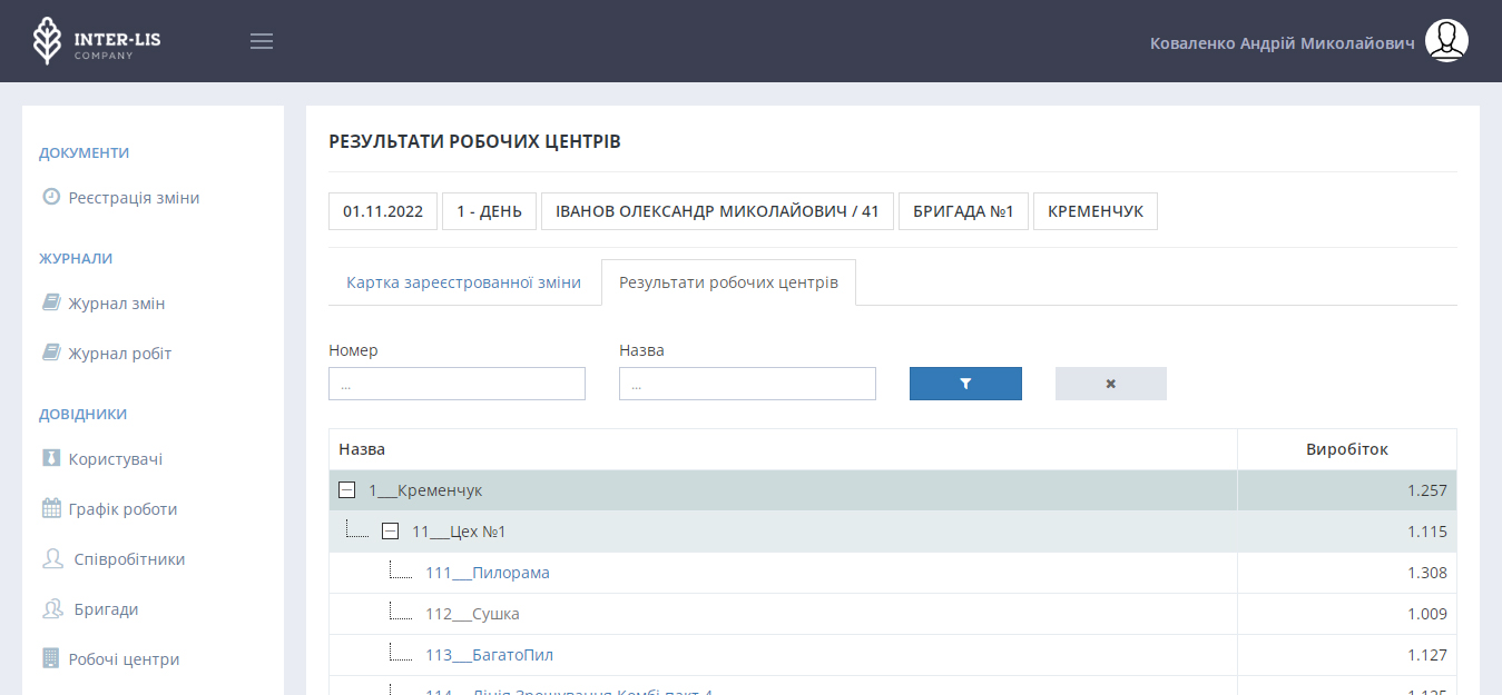 После сохранения смены можно перейти в раздел «Результаты рабочих центров», там можно увидеть все рабочие центры в иерархической последовательности. Рядом с оборудованием, если есть данные и произведен расчет, можно увидеть КТУ, по цеху и по городу – высчитывается средний показатель по «внутренним» РЦ 3 уровня.