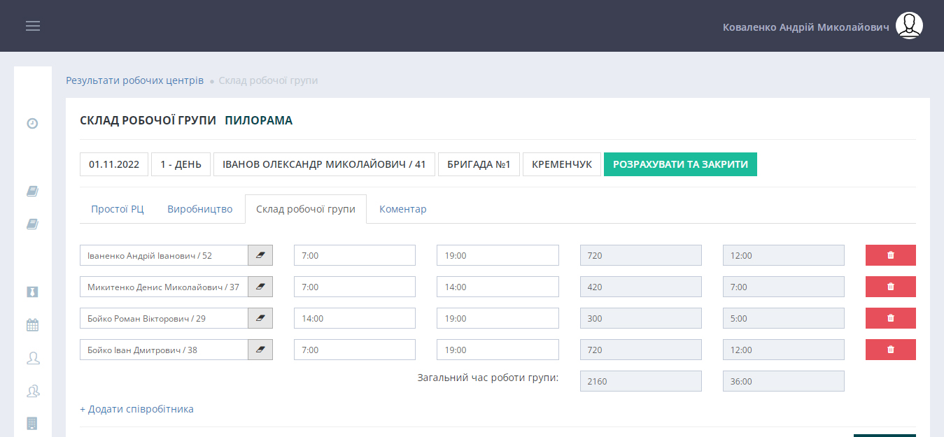 На странице «Состав рабочей группы» можно динамически добавлять/удалять сотрудников. По каждому из них автоматически подсчитывается общее время в минутах и в формате «часы:минуты». Внизу списка выводится общее время работы группы. Каждая запись проверяется на накладки, в том числе один сотрудник не может работать в другом цехе в одно и то же время.
