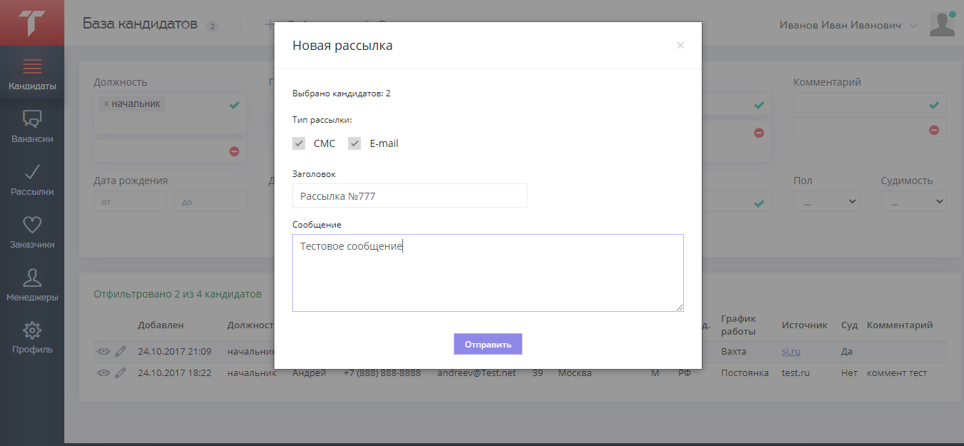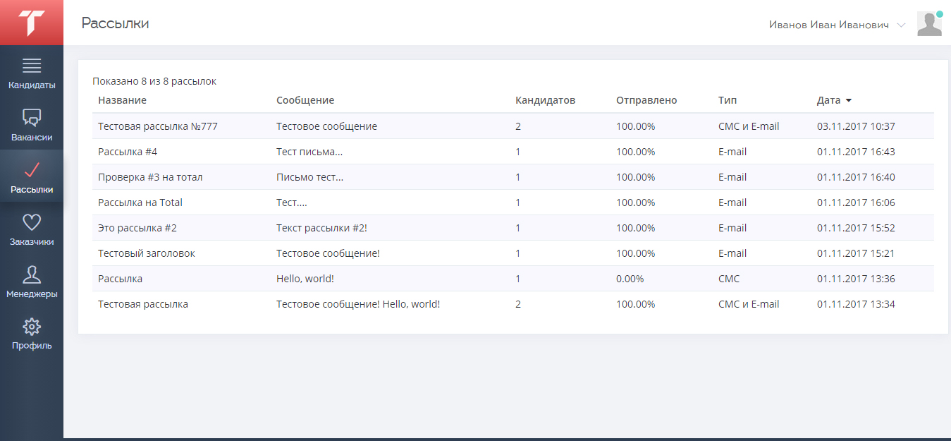 Для отфильтрованных кандидатов можно создать рассылку, указав ее название, текст сообщения и ее тип. Отправить письмо можно через SMS-службу, работа с которой происходит благодаря API-интеграции, или на адрес электронной почты соискателя работы. Данные о процентном выполнении каждого задания можно увидеть в разделе «Рассылки».