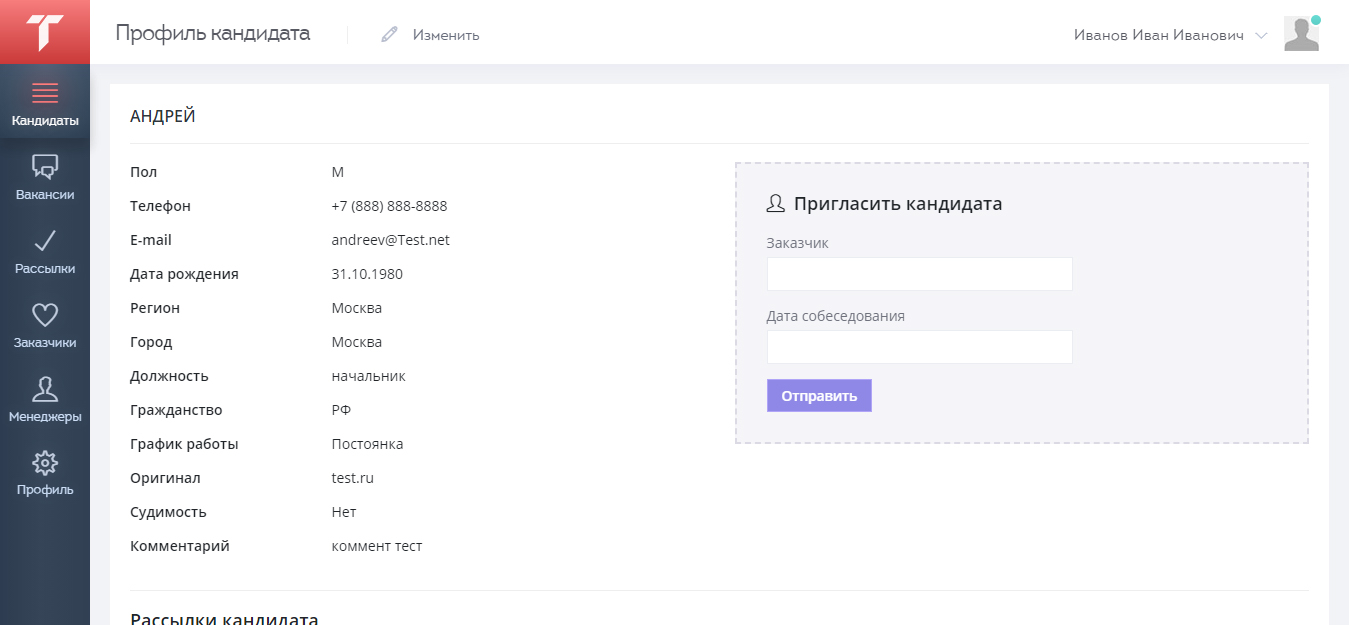 Раздел «База кандидатов», включает в себя множество фильтров, в том числе исключающих из поиска: по должности, по городу и области, по источнику, по комментарию, по дате рождения, по дате добавления, по гражданству, по графику работы, по полу и по судимости. В разделе можно добавить кандидата на работу, просмотреть и редактировать его профиль, отправить приглашение на собеседование.