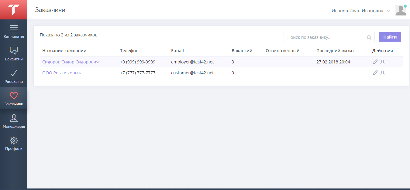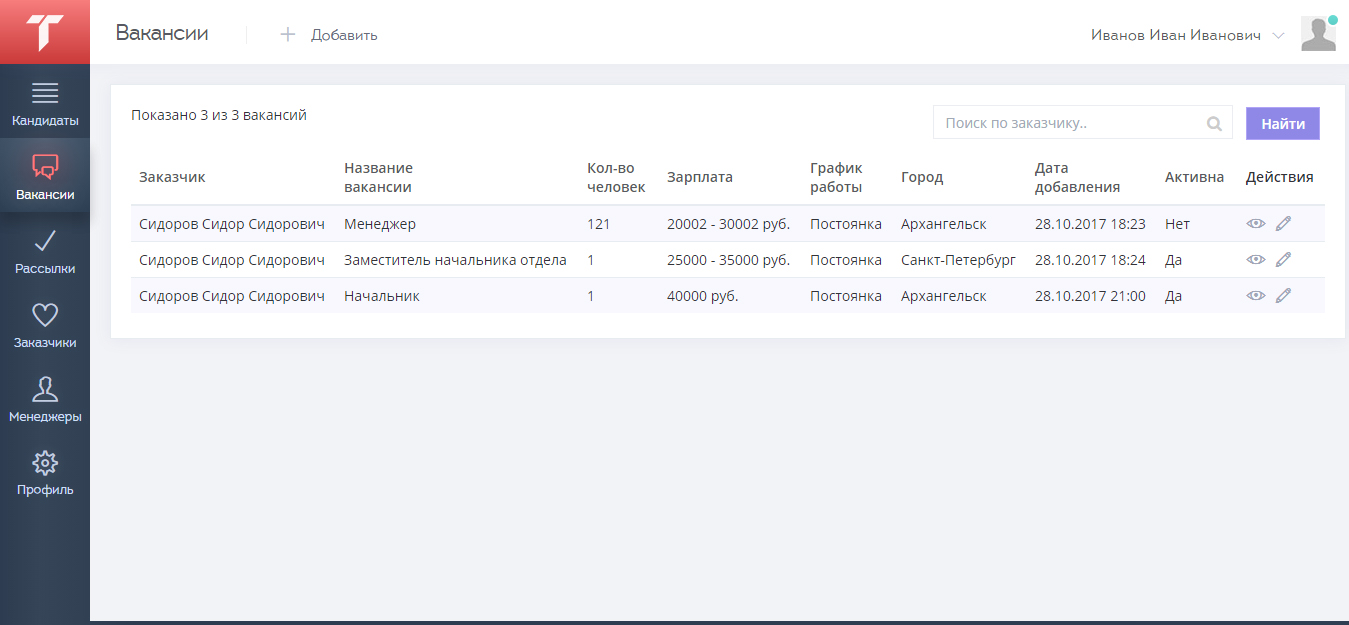 В разделе «Заказчики» можно увидеть список работодателей, за каждым из них закрепляется ответственный менеджер. Каждый заказчик может создать вакансию в одноименном разделе с информацией об ее названии, количестве человек, зарплате, графике работы, регионе, а так же поставить отметку «активна ли она на данный момент».