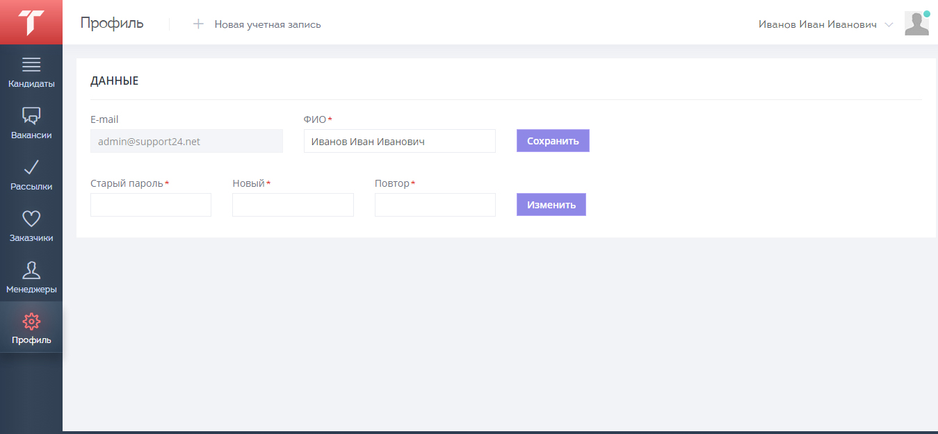 У администратора в CRM больше всего прав, он видит всех, может добавлять, редактировать и удалять сотрудников из раздела «Менеджеры». Менеджеры видят только своих заказчиков, за которыми они закреплены как ответственные. В разделе «Профиль» пользователь может сменить свое ФИО и пароль для входа в личный кабинет.