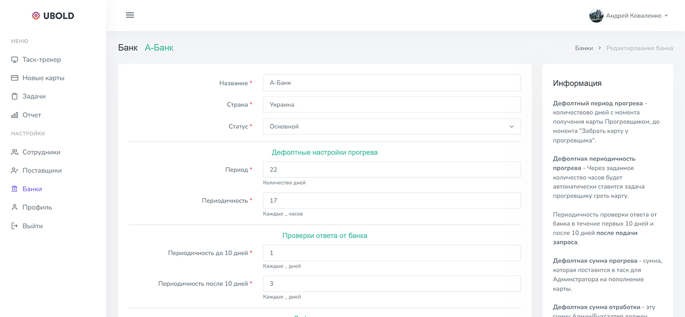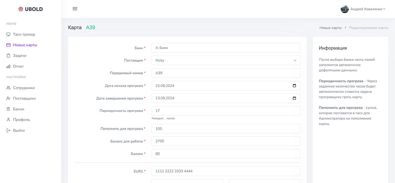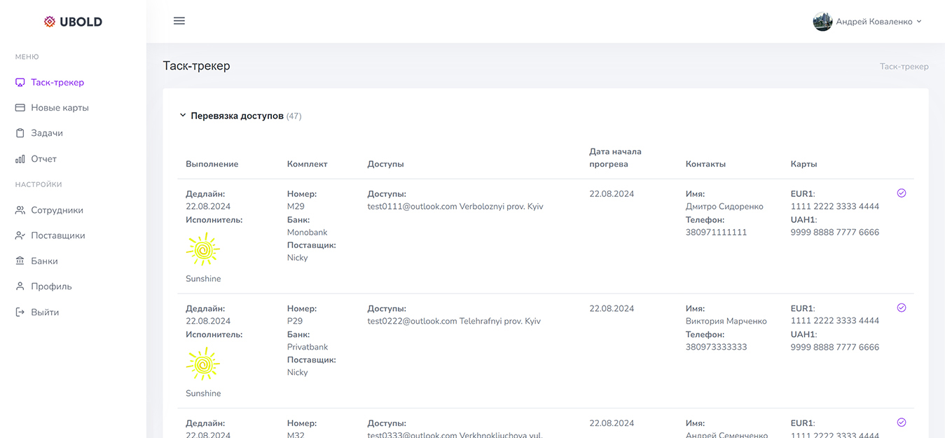 Основной раздел сайта – «Таск-трекер», где размещены все задачи по картам согласно их статусу: «Перевязка доступов», «Пополнение на прогревочную сумму», «Период прогрева», «Забрать доступ у прогревщика», «Пополнить карту для работы», «Отработка карты», «Подать заявление в банк», «Отлежка/Периодическая проверка ответа от банка» и «Возврат поставщику».