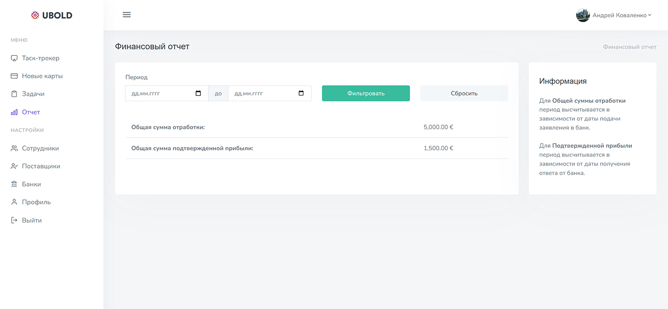 Для владельца также доступен финансовый «Отчет»: по общей сумме отработки и по общей сумме подтвержденной прибыли. Фильтр по периоду для первого показателя учитывает даты транзакций, а второго – даты получения ответа от банка.