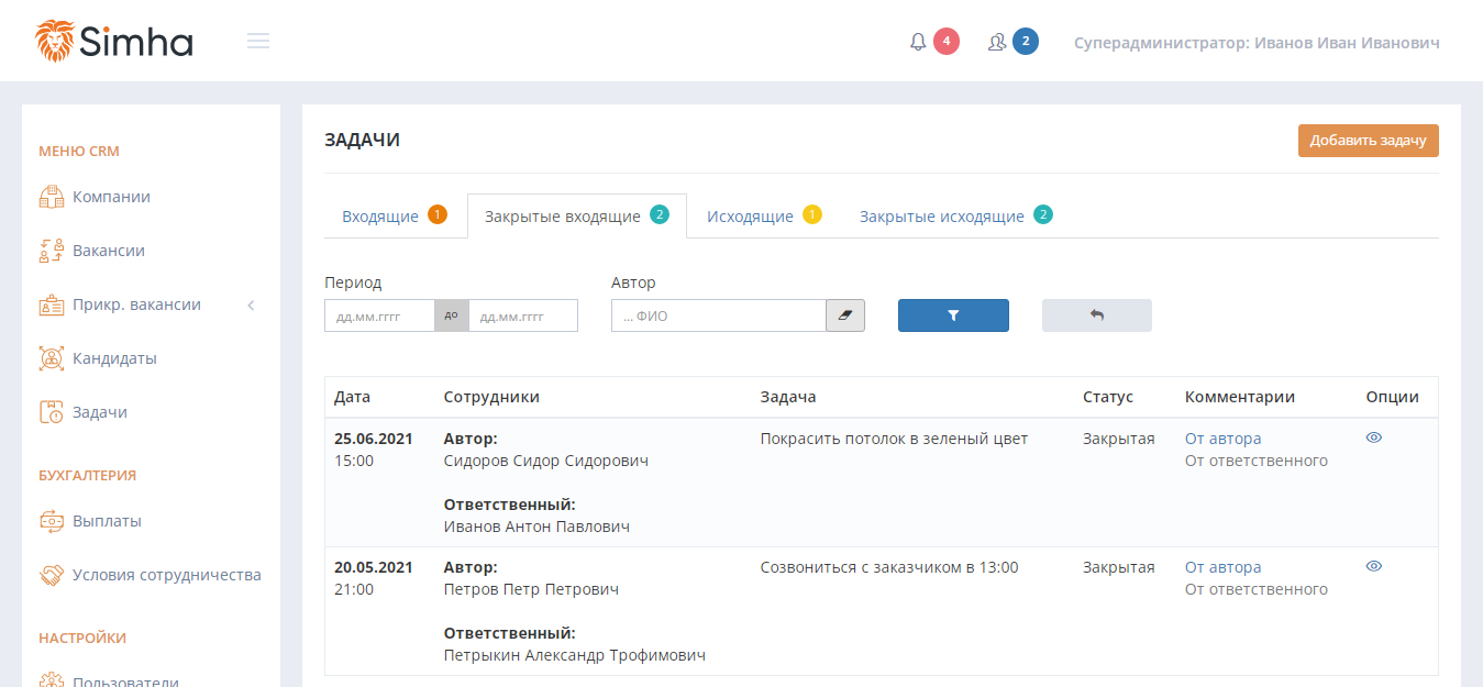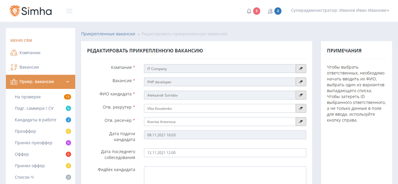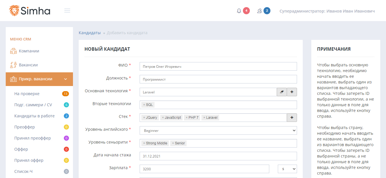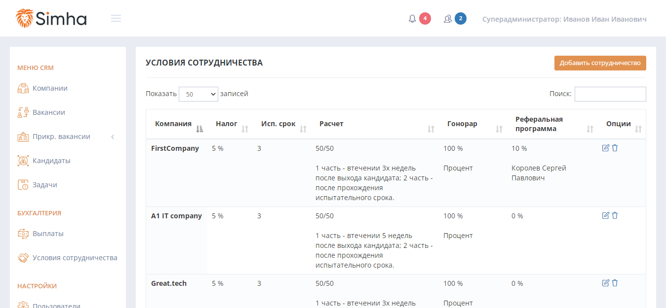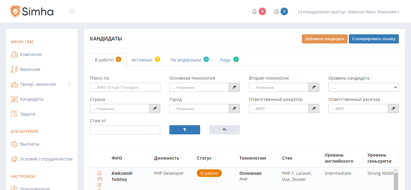 В CRM-системе для рекрутинговой компании «Simha», было предусмотрено 9 ролей пользователей: суперадминистратор, администратор, координатор, рекрутер, удаленный рекрутер, ресечер, удаленный ресечер, фрилансер и бухгалтер.