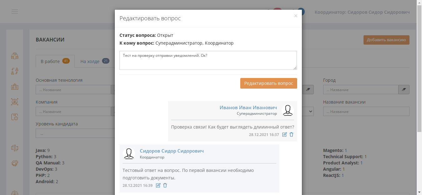 В разделе «Вакансии» 5 вкладок: «В работе», «На холде», «На модерации», «Вопросы» и «Спарсенные». Все вакансии, которые созданы не суперадмином и не координатором, создаются со статусом «На модерации», и попадают в работу только после утверждения. По каждой вакансии можно задать вопрос и адресовать его определенным ролям (их может быть несколько), переписка ведется в модальном окне без перезагрузки страницы, так же все открытые вопросы можно просматривать в соответствующей вкладке. По вакансиям, которые находятся «На холде» - с течением времени вопросы-ответы затираются системой по крону с учетом утраты актуальности этих данных и оптимизации работы с БД.