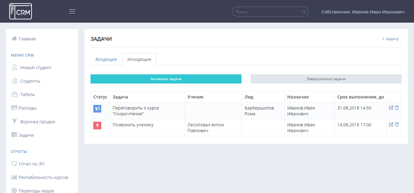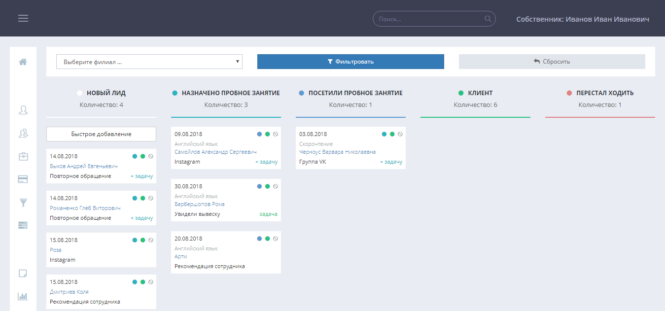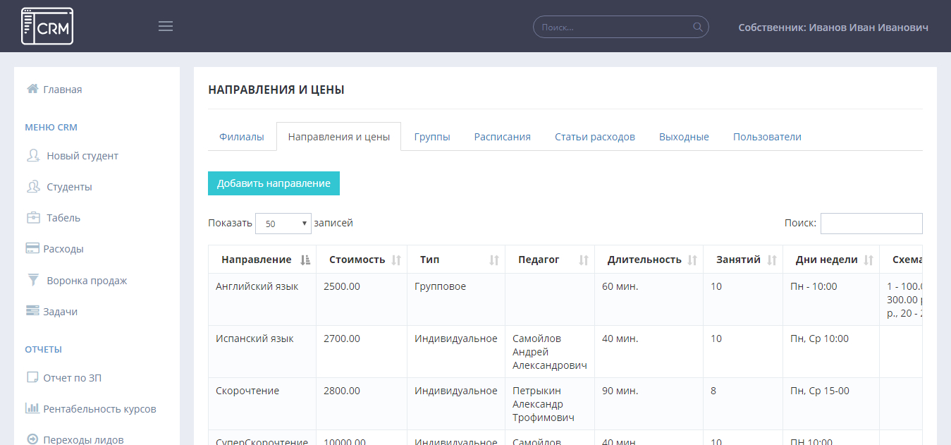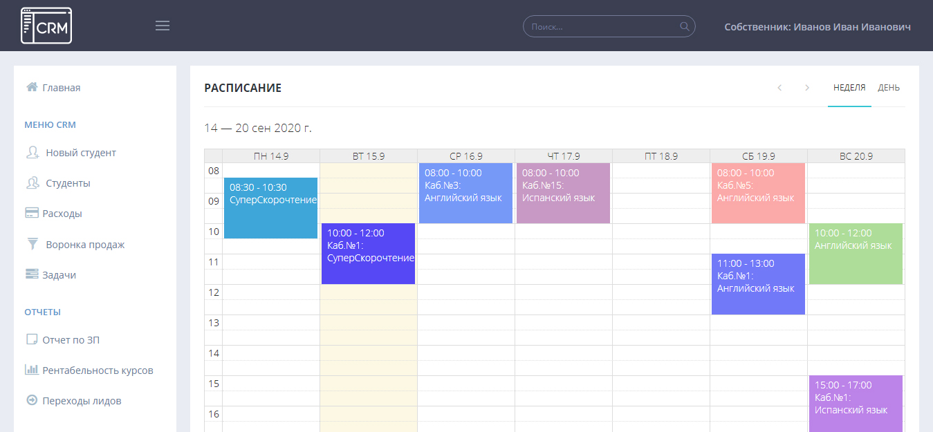 Нами разработана CRM-система для учебного центра со множеством разделов и следующими ролями: собственник, директор центра, педагог и студент.