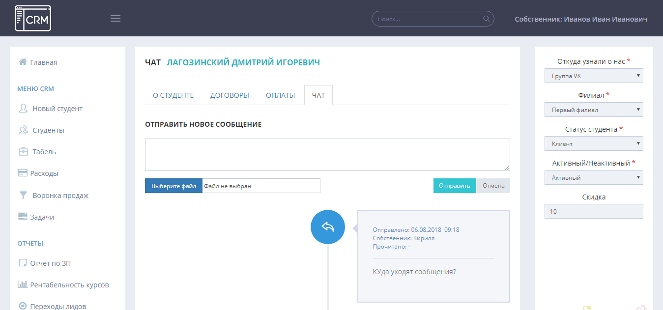 Раздел «Студенты»: таблица с поиском и фильтром по учащимся в центре. При добавлении студента создается карточка, которая включает в себя данные о нем, перечень заключенных договоров и оплаты по ним, так же чат - студент/сотрудники центра.