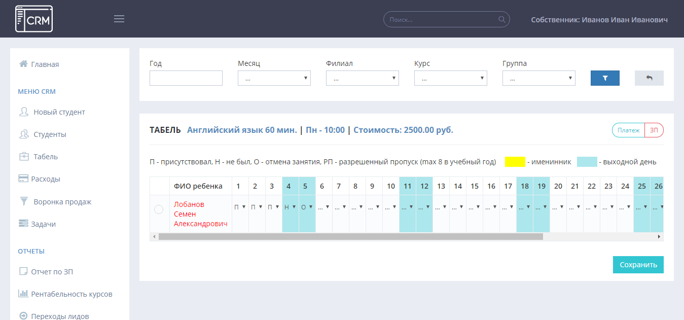 В разделе «Табель» педагог вносит данные о посещаемости студента, у которого есть лимит занятий, которые если он пропустит не учитываются в стоимости. Каждый педагог просматривает только свои курсы или группы. Ему выделены цветом студенты, которые просрочили платежи или у которых сегодня день рождения. Так же есть возможность узнать – с какого числа у студента началась просрочка.